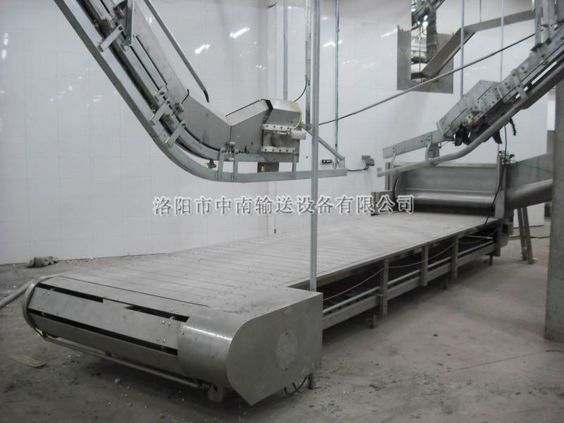 平板輸送機:該機用于麻電后的牲豬輸送, 上掛至放血線的配套設備。該機主要由機架、電機、減速機、板鏈、鏈輪,拖輥等部件構成,具有結構簡單、運轉平穩(wěn),維修方便等優(yōu)點。是大、中型屠宰加工廠不可缺少的設備。